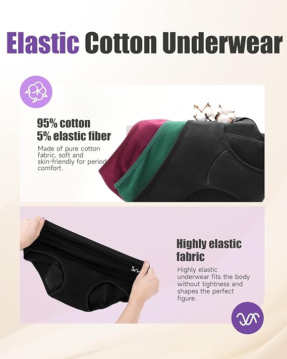 Cómodo de usar: la ropa interior de época está diseñada para adaptarse a la cintura alta al cuerpo y tiene una doble capa para proporcionar una mejor protección para las mujeres durante los períodos. Tela transpirable y cómoda que te permite moverte libremente incluso durante tu período menstrual. Estos pantalones de período están hechos de 95% algodón natural y 5% elastano. Tejidos de calidad para una experiencia de uso excepcional