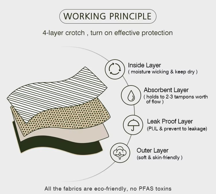 Braguita menstrual, tiene un diseño especial a prueba de fugas de 4 capas. Junto con la almohadilla, es una buena manera de evitar fugas laterales durante el sueño y evitar la vergüenza durante el trabajo y la vida escolar. Recomendamos encarecidamente que se use junto con toallas sanitarias, tampones, pantimedias, copas menstruales, almohadillas de maternidad para días con ciclo menstrual de flujo pesado